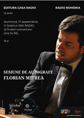 Festivalul Internațional „George Enescu” continuă, iar Editura Casa Radio însoțește diversele concerte întâmpinând publicul cu albumele sale. O astfel de ocazie este și evenimentul ce se va desfășura duminică, 17 septembrie, începând cu ora 13.00 la Sala Radio din capitală: la finalul concertului ce-l va avea ca solist pe Florian Mitrea, tânărul pianist român stabilit în Anglia va oferi publicului, în Foaierul central al Sălii de concerte, o sesiune de autografe pe albumul său apărut anul trecut la Editura Casa Radio sub titulatura „Beethoven – Unending. Florian Mitrea – piano”.